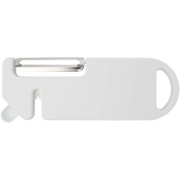 This multi-purpose kitchen tool combines four essential functions in one compact design. Made from recycled plastic, it features a peeler, bottle opener, knife sharpener, and a pointed tip for removing potato blemishes. A built-in hanging hole allows for easy storage. Practical and space-saving, it’s a versatile must-have for every home cook.